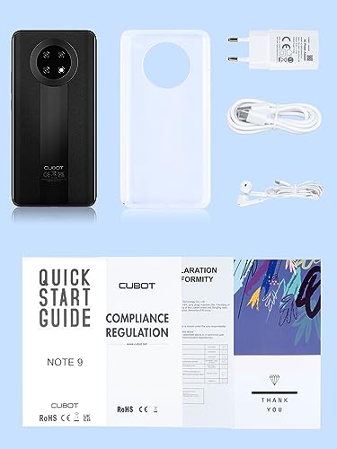【Cosa c'è nella confezione】1x telefono CUBOT Note 9 (senza contratto), 1x batteria da 5900 mAh (batteria sostituibile), 1x caricabatterie, 1x cavo USB, 1x guida rapida, 1x custodia per il telefono (già montata sul telefono), 2 anni di garanzia e servizio clienti cordiale. (Nota: cuffie non incluse)
