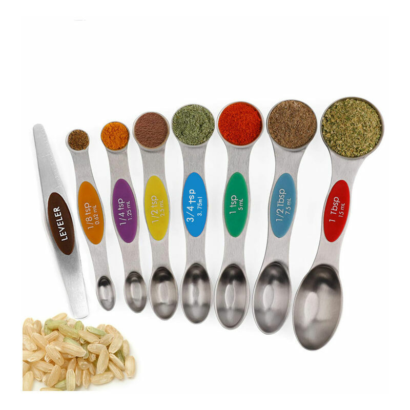 Cucchiai dosatori precisi: Set di 8 misurini di diverse dimensioni Con il livellatore incluso puoi misurare la quantità esatta e le etichette con codice colore ti consentono di trovarle rapidamente durante la cottura, precise e facili da leggere, cucchiaino /cucchiaio & mL. Misuratore a doppia faccia per liquidi e secchi: il design a doppia estremità rende i misurini compatibili con la misurazione di ingredienti secchi e liquidi, l'ingrediente liquido arrotondato e l'estremità ovale stretta possono adattarsi alla maggior parte dei barattoli di spezie o bottiglie. La base piatta consente ai cucchiai di appoggiarsi sul bancone senza rovesciare il contenuto. Design magnetico per un facile utilizzo e conservazione: ogni pezzo di questo set di cucchiai dosatori ha un centro magnetico che ne facilita l'impilamento cassetto e risparmiare spazio;