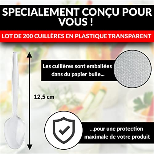 RIUSABILEE DUREVOLE - Questa confezione da 200 cucchiai di plastica può essere utilizzata più volte. Misura 12,5 cm ed è trasparente, per mettere in mostra le vostre migliori preparazioni culinarie. Per il gelato o la torta, questa confezione di mini cucchiai riutilizzabili è adatta al dessert. Il piccolo cucchiaio di plastica è un vero vantaggio in cucina.