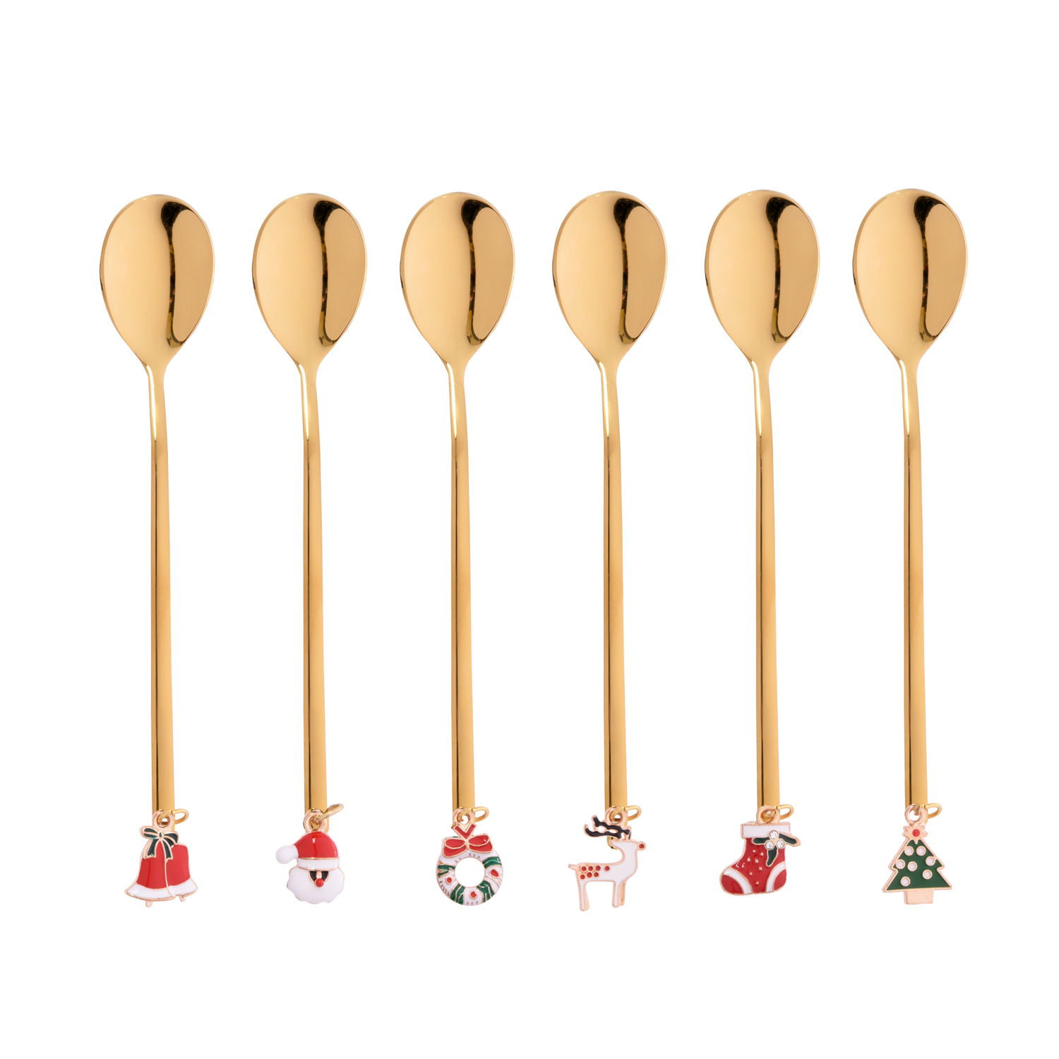 Quanto è carino questo servizio di posate natalizio? Starà benissimo sulla tua mise en place delle feste, perfetto per gustare una macedonia con gelato, un dolce al cucchiaio o zuccherare il tuo caffè. Il set posate per 6 persone è caratterizzato da cucchiaino in acciaio inox 18/0 con finitura color oro. Il dettaglio unico? Il ciondolo all'estremità del manico che raffigura 6 simpatici soggetti di Natale, dalla renna alla ghirlanda. Ideale per personalizzare ogni posto a tavola, sarà un regalo davvero originale e apprezzato. Per conservare la qualità del prodotto si consiglia il lavaggio a mano o in lavastoviglie a basse temperature.