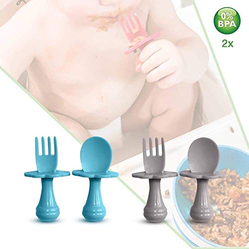 Cucchiaino per bambini - Forchetta per bambini - Cucchiaio e forchetta per bambini, multicolore, posate per incoraggiare il bambino a mangiare in modo indipendente, senza BPA. (2 Imposta, Blu/Grigio)