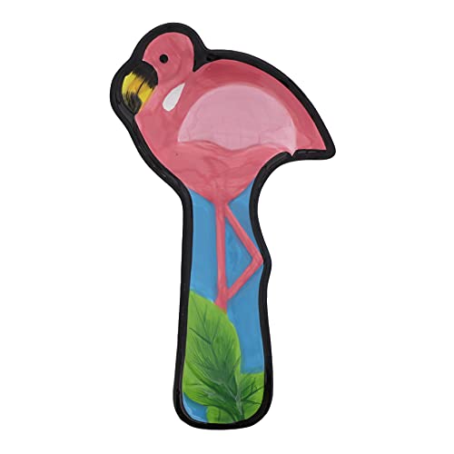 Porta stile e praticità alla tua cucina con questo cucchiaio di fenicottero poggia cucchiaio. Il fenicottero è rosa e si erge su uno sfondo blu con foglie tropicali. Il bordo esterno del poggiapiedi è nero per un look eccezionale.