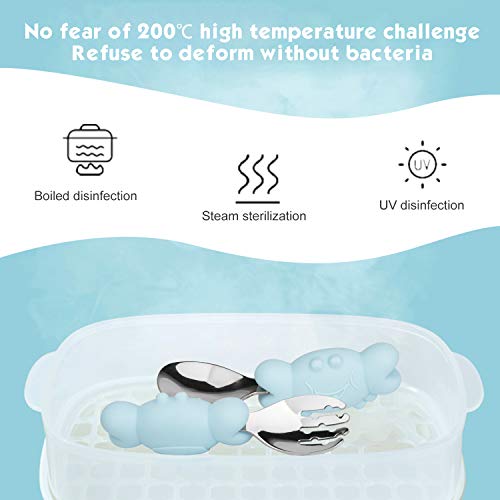 【Materiale sicuro】 Acciaio inossidabile premium lucidato a specchio. Non graffierà, non si romperà, non si scheggerà, arrugginirà o ammaccerà. Privo di materiali pericolosi, mentre i manici sono realizzati in silicone alimentare che è privo di BPA e ftalati. Il nostro cucchiaio forchetta per bambini è di sicurezza alimentare, progettato specificamente per il bambino