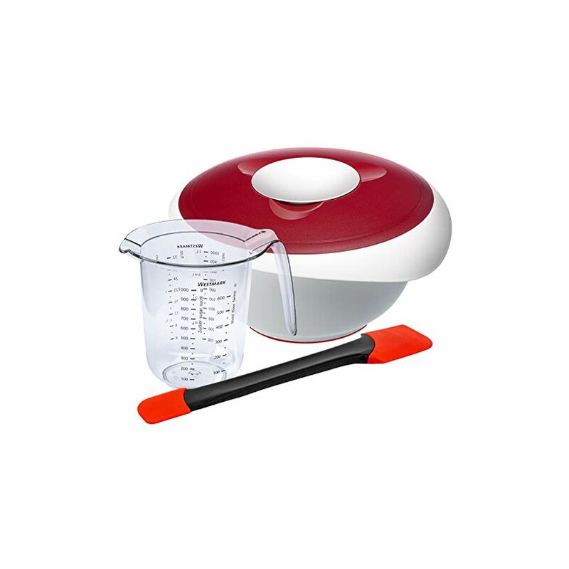 Westmark Set da cucina e da forno, 3 pezzi, ciotola con coperchio da 2,5 l, caraffa dosatrice da 1 l e raschietto per impasto, in plastica/silicone, Duo, bianco/rosso/nero, 315322E6 29,0 x 29,0 x 21,0