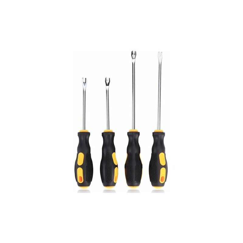 Materiale eccellente La clip per tappezzeria e il kit di rimozione dei punti metallici sono realizzati in acciaio 45# di alta qualità e manico in gomma, che è resistente e durevole, la superficie è liscia, priva di graffi e non facile da rompere per molto tempo. Impugnatura ergonomica Il design della leva riduce la forza necessaria per risparmiare tempo ed energia. Con un'ampia impugnatura in gomma, non scivolerà durante la rimozione delle puntine, evitando che la tua mano si faccia male. Facile da usare Con questi strumenti, puoi rimuovere rapidamente e facilmente i fermagli e l'imbottitura della portiera dell'auto senza causare danno. Devi solo inserire la sonda sotto la clip e rimuoverla senza sforzo grazie al meccanismo a bilanciere. Il set di estrattori per chiodi ampiamente utilizzato può aiutare a rimuovere rapidamente i punti metallici in profondità nei tuoi mobili, tappezzeria, legno, pavimenti, industriale, cartongesso, perni portanti isolanti, ecc. Il set di estrattori per