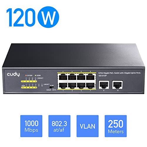 Cudy alimentatore 8+2 porte Gigabit Ethernet PoE+ Unmanaged Plug-and-Play Switch,120 W, 8 x 10/100/1000 Mbit/s PoE+ porte, CCTV/VLAN-Modus, 802.3af/ 802.3at GS1010P