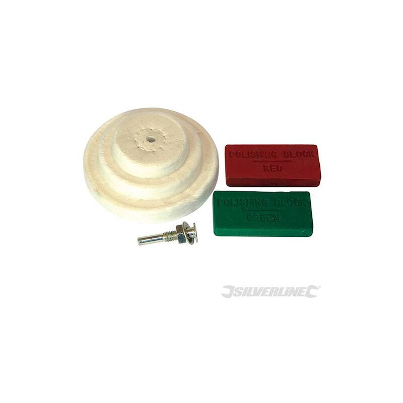 Contiene 3 ruote cucite lucidatura (50, 75 e 100 mm). 6mm (1/4 ) di attacco mandrino adatto per la maggior parte dei trapani. Prodotti lucidanti rosso e verde. Cod. 153203 6 pezzi.