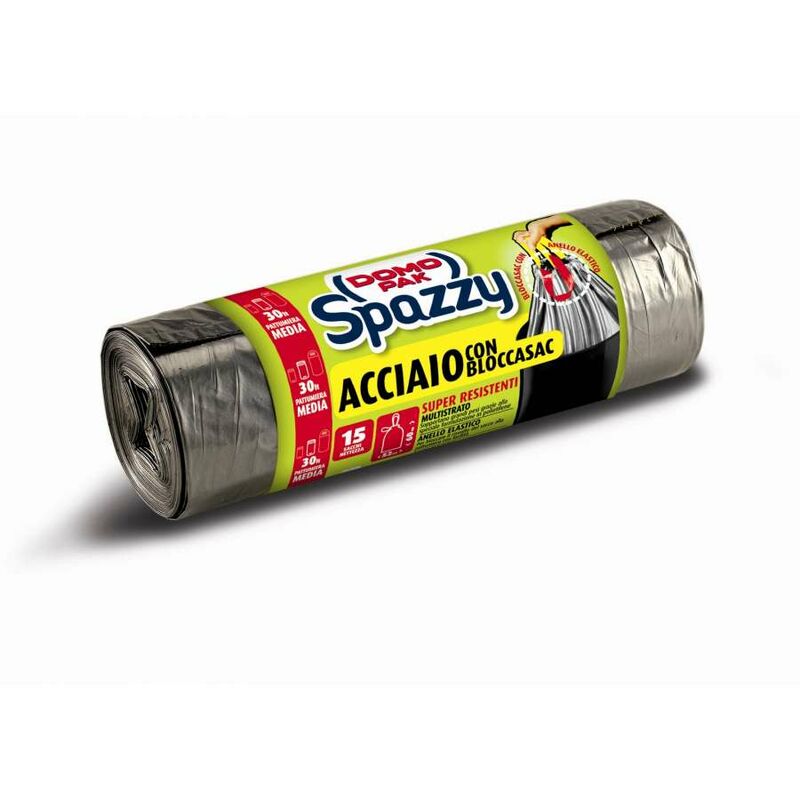 Sacco casalingo grigio metallizzato. Sistema brevettato Bloccasac. 52 x 60 cm Tipologia - Sacchi rifiuti Marca - Domopak spazzy Modello - 9840 Lunghezza - 60 cm Larghezza - 52 cm Colore - Nero Quantità - 15 Caratteristiche - Super resistente e antigoccia, sopporta grandi pesi grazie alla speciale formulazione multistrato. Sistema brevettato Bloccasac, per bloccare il risvolto del sacco alla pattumiera ed evitare che il sacco ricada all'interno. Capacità - 30 l