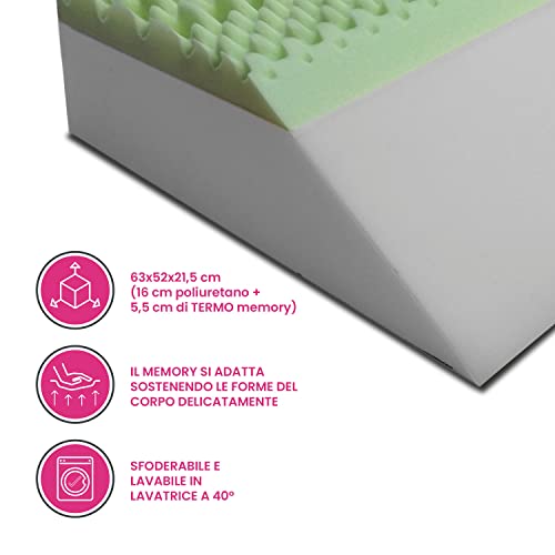 DIMENSIONI del cuscino cuneo gambe: 52x63 e alto 21.5 cm di cui 5 cm di memory foam SUPER TRASPIRANTE CHE NON SCALDA, a zone differenziate, molto comodo, che ospita i pesi del corpo avvolgendoli in una dolce pressione. Cuscino prodotto in poliuretano waterfoam ad alta densità, indeformabile e privo di CFC. Materiali NON DI IMPORTAZIONE ma prodotti ed elaborati in ITALIA.
