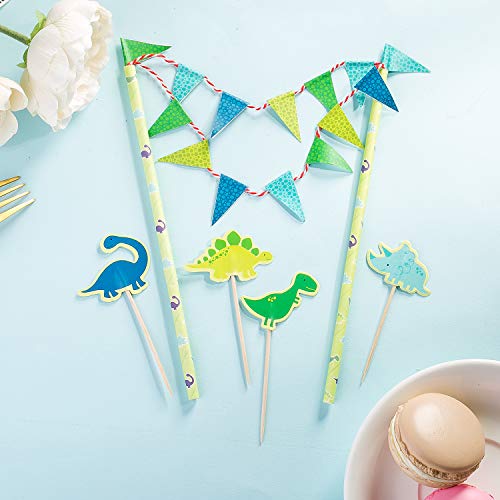 Set di decorazioni per torte: 1 * ghirlanda di pennant, 4 pezzi di toppers per cupcake di dinosauro in 4 diversi colori consegnati, che puoi decorare una bella festa, carina e divertente sul tema.