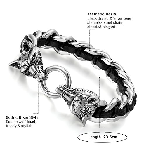 Cupimatch - Bracciale da uomo in acciaio inox, con testa di lupo in pelle intrecciata nera, 22,5 cm