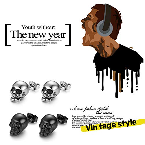 Cupimatch Hip Hop Punk Uomo Orecchini Teschio Cranio Acciaio Inossidabile Argento Nero(2 Paia)