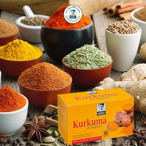 La curcuma di BADERs in zenzero della farmacia. Tè speziato selezionato secondo la tradizione ayurvedica. 2x20 sacchi filtro.
