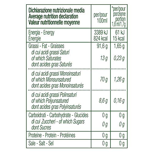 Grazie alla tecnologia "bag on valve", lo speciale flacone Sprayleggero permette di ridurre i consumi del 90% circa (un flacone equivale da 250 ml infatti a 3 litri circa di una normale bottiglia di olio) e di proteggere il contenuto da aria e luce per lungo tempo. Ciò consente di mantenere inalterate tutte le pregiate proprietà del condimento e di conservarlo sempre fresco come appena spremuto. Ogni secondo di spruzzo eroga 1,8 ml/1,7 g (15 Kca