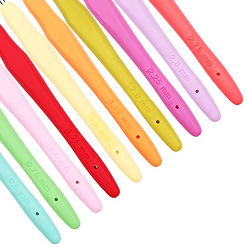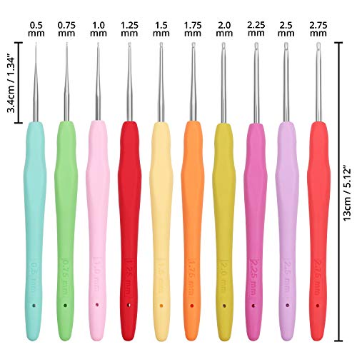 10 MISURE PER TUTTI I PROGETTI: Ogni uncinetto alluminio di questo set misura 13 cm di lunghezza. Ogni gancio in questo uncinetto set è di un colore diverso e le dimensioni sono chiaramente etichettate sul manico per una facile identificazione e selezione. Le dimensioni incluse sono 0,5, 0,75, 1, 1,25, 1,5, 1,75, 2, 2,25, 2,5 e 2,75 mm. La parte in alluminio del gancio misura 3,4 cm.