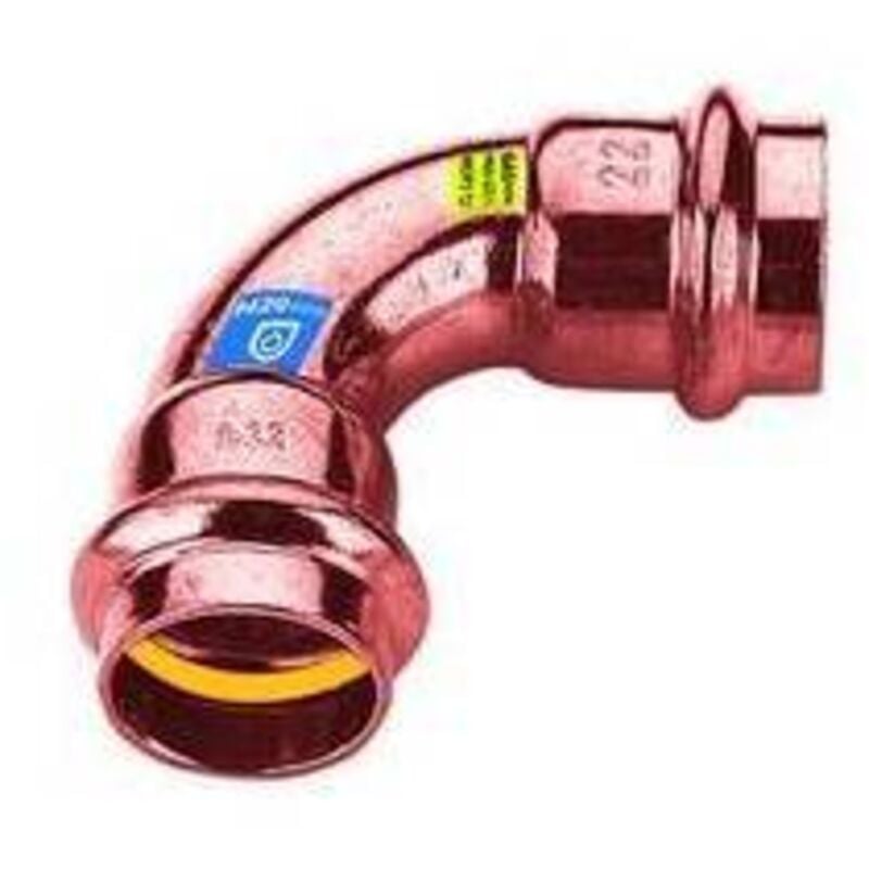 Raccordi in rame CW024A a pressare FRABOPRESS SECURFRABO. Raccordo unico per acqua e gas. Rame secondo EN1057. O-ring giallo in HNBR. Profilo di pressatura: V.
