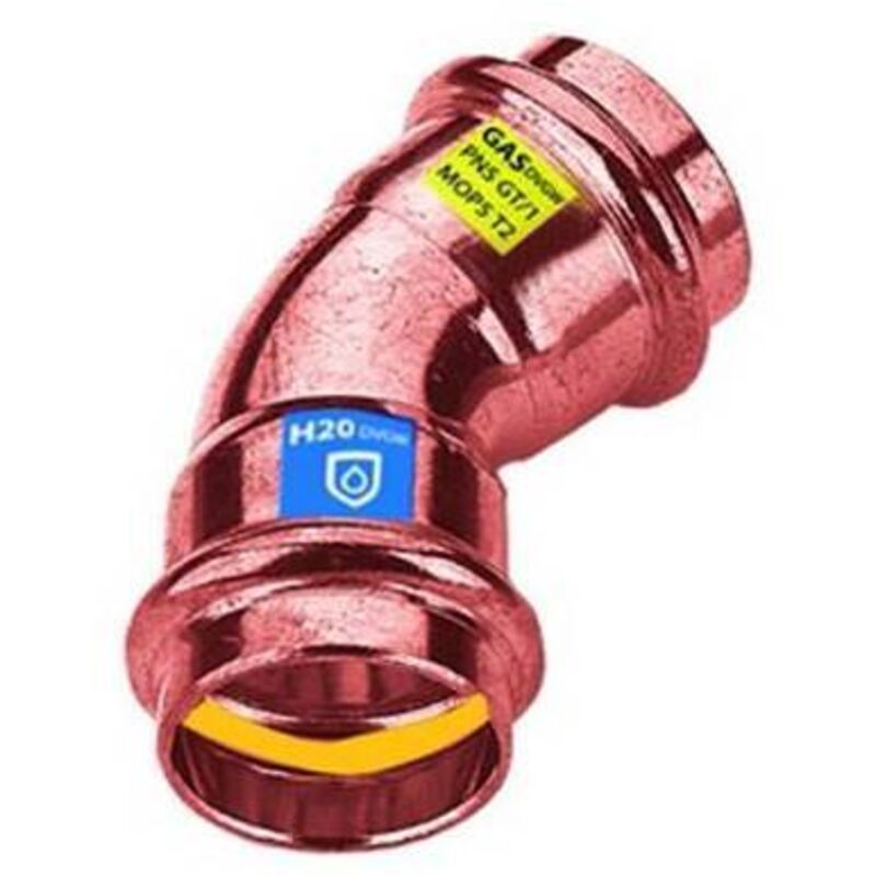 Raccordi in rame CW024A a pressare FRABOPRESS SECURFRABO. Raccordo unico per acqua e gas. Rame secondo EN1057. O-ring giallo in HNBR. Profilo di pressatura: V.(DianFlex)Misura: Diam. 28