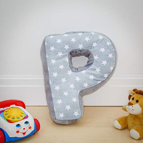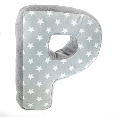 Cuscino a forma di lettera P | Lettera P | Cuscino decorativo per cameretta dei bambini, divano letto | Lettera | Iniziale personalizzabile | Stelle grigie | Regalo di nozze battesimo