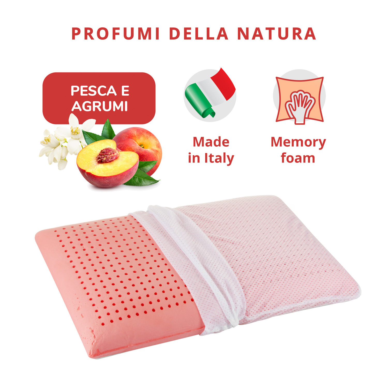 Per garantirti il migliore riposo ha creato una linea di cuscini letto in memory foam traspiranti, completamente Made in Italy. La particolarità è data dalle delicate essenze di Pesca e Agrumi che arrichiscono l'anima del guanciale, aiutando ad alleviare lo stress, conciliare il sonno e favorendo un generale rilassamento e benessere del corpo. L'anima in memory foam segue la conformazione del capo sostenendo il peso in modo corretto e, grazie alla sua capacità automodellante, ha proprietà benefiche anche per chi soffre di dolori cervicali. Previene dolorose contratture e irrigidimenti del collo ed è inoltre anallergico e sfoderabile. Misure: 42x72x13 cm.