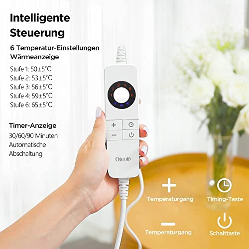 Spegnimento automatico e protezione da surriscaldamento: La temperatura massima è di circa 65 C / 149 F (±5 C), adatto per la temperatura corporea umana, risparmia energia, previene il surriscaldamento ed è molto sicuro. impostare contemporaneamente un riscaldamento temporizzato da 30 a 90 minuti. impostare contemporaneamente un riscaldamento temporizzato da 30 a 90 minuti. Dopo la scadenza del timer, si spegne automaticamente, in modo sicuro ed efce
