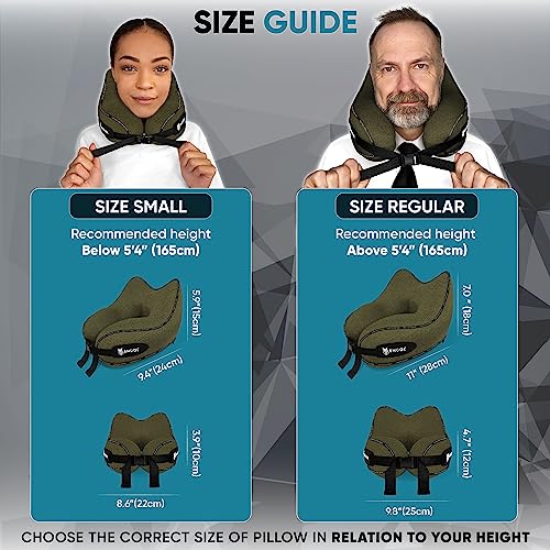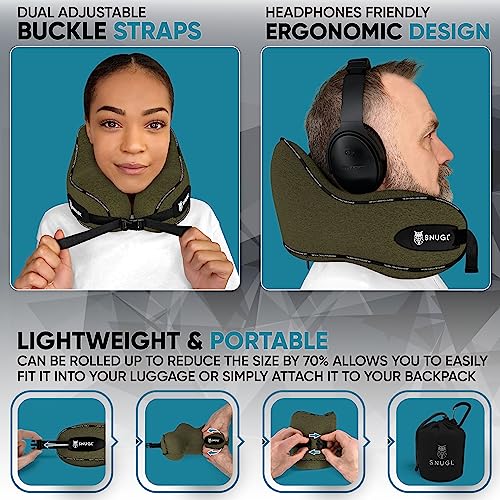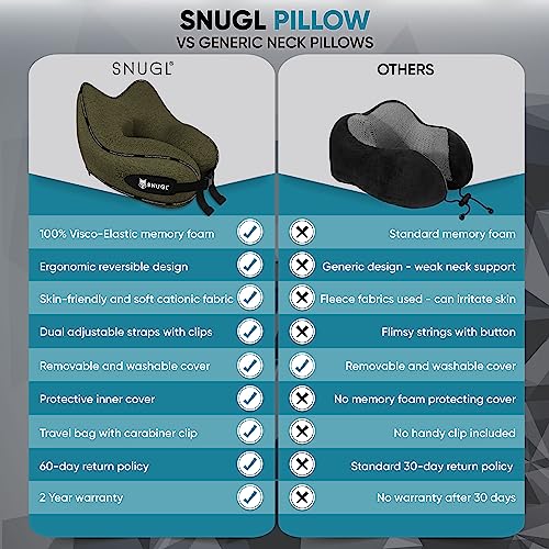 Cuscino da viaggio SNUGL - Cuscino in memory foam dal design ergonomico di alta qualità, borsa da viaggio con clip inclusa (Verde Oliva)