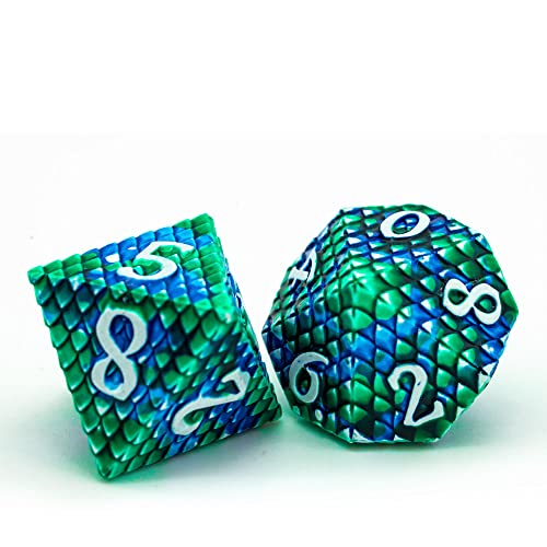 Cusdie Set di dadi in metallo, 7 pezzi DND in metallo, set di dadi poliedrici a scala drago, per giochi di ruolo D&D Dice MTG Pathfinder (blu/verde con numeri bianchi)