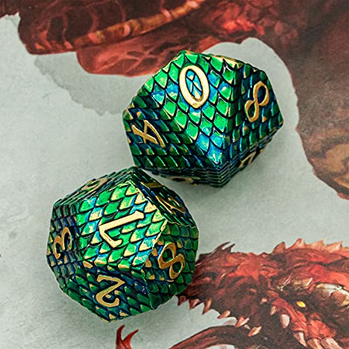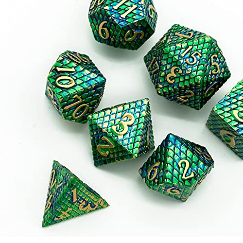 Cusdie Set di 7 dadi in metallo, poliedrici a scala di drago, per giochi di ruolo, D&D (blu/verde con numeri dorati)
