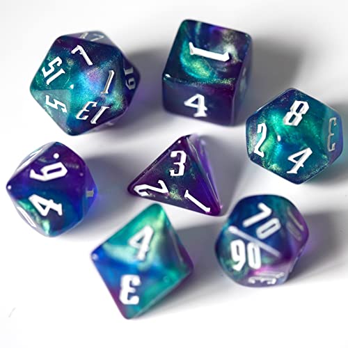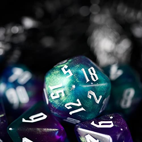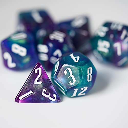 Cusdie Set di dadi DND D&D dadi poliedrici Dungeons e Dragons Pathfinder MTG giochi di ruolo giochi di dadi RPG (verde viola con brillantini)