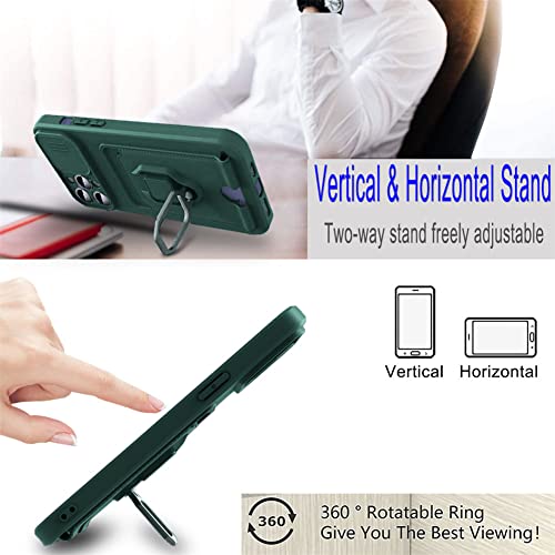 Custodia per cellulare in silicone compatibile con Apple iPhone 13 Pro Max, custodia Slide per fotocamera, con anello magnetico, cordino e scomparto per carte di credito, cover in TPU (verde scuro)