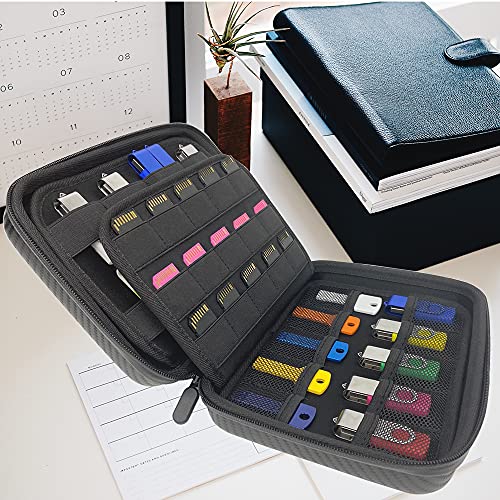 Grande capacità e tuttavia compatto: 16 ampie fasce elastiche per unità flash di diverse dimensioni/30 slot semi cuciti per schede di memoria/10 piccole tasche a rete per unità flash o schede di memoria/una grande tasca a rete per il disco rigido, alimentazione banca o alcuni dispositivi di maggiore lunghezza. Dimensioni della cassa: 23 x 17 x 5,8 cm.