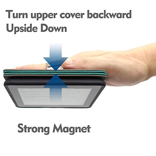 Quando la copertura superiore viene ruotata per la lettura, verrà attratta dal retro del coperchio inferiore tramite un magnete, con una forza abbastanza forte da tenerli insieme, permettendoti di fare scorrere la mano attraverso il cinturino tenendolo capovolto per leggere stando sdraiati sul letto. Quando è chiuso, il coperchio superiore sarà attratto dall'e-reader per mantenere chiuso il coperchio superiore.