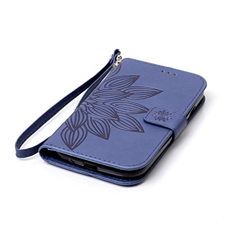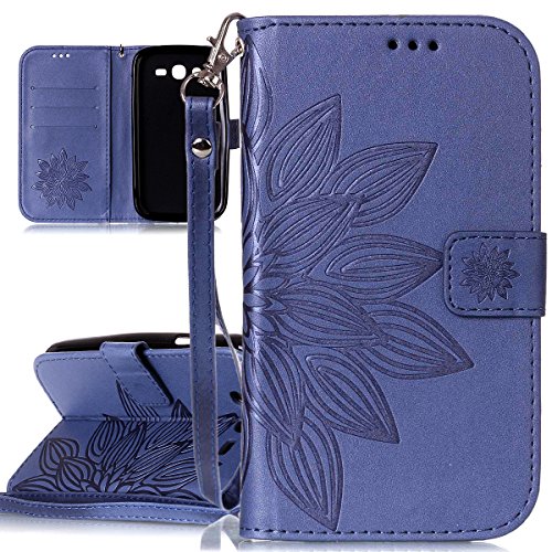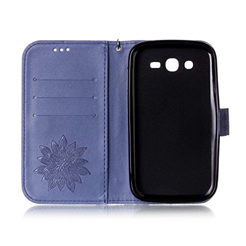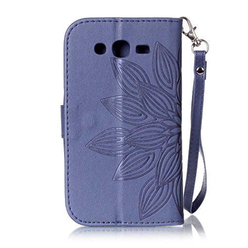 Custodia Galaxy Grand Plus / Grand Neo / Grand Lite, ISAKEN [Shock-Absorption][PU Pelle] Protettiva Sbalzato Embossed Design Custodia Flip Portafoglio Wallet Protezione Caso con Supporto di Stand / Carte Slot / Chiusura per Samsung I9082 - fiori:blu