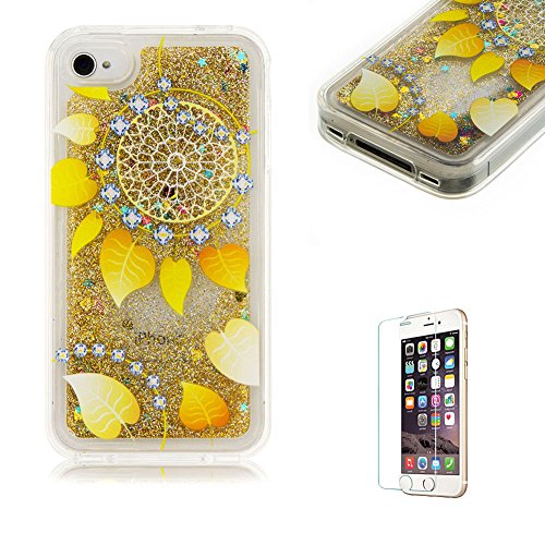 Custodia Per iPhone 4 4S Cover in Silicone Morbida,Funyye Brillantini Muovono Liquida Sequin Giallo Glitter Flowing Quicksand 3D Creative Disegno Copertura +[Pellicola Protettiva] Sottile Gomma Gel TPU Protettivo Caso Per Apple iPhone 4/4S Soft Shine Bling Liquid Case Shell Bumper - Foglie Oro
