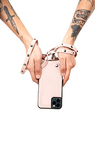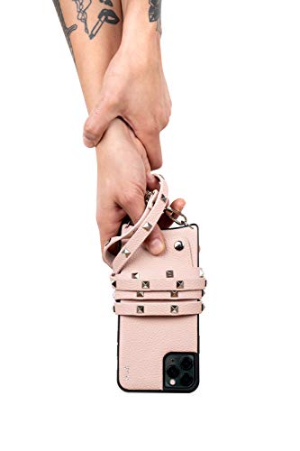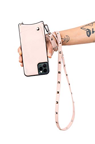 Aux Custodia iPhone X/XS con nastro per appendere | Pelle Vegano | Tasca posteriore per carte | Nastro con borchie argentate da appendere | Taglia: iPhone X/XS, Rosa