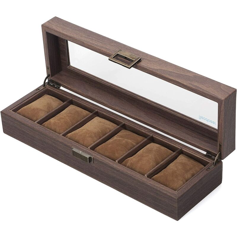 Con un coperchio in vetro, puoi trovare facilmente i tuoi orologi. Rivestimenti in velluto negli scomparti, perfetti per riporre tutti i tipi di orologi e braccialetti. Alta qualità costruzione, finitura in finto legno, design naturale ed elegante. Ideale per collezionisti, negozi, motivo di vendita o semplicemente per gli amanti degli orologi. Contiene fino a 'per 6 orologi o braccialetti . Descrizione del prodotto La scatola ideale che ti aiuterà a tenere in ordine i tuoi orologi e bracciali. Il coperchio in vetro ti permette di trovare l'orologio che stai cercando senza dover aprire la scatola, è anche un bellissimo display per i tuoi orologi. L'intera scatola è realizzata in ecopelle finta legno, con un design naturale ed elegante. Pertanto, può essere utilizzato per scopi personali o commerciali. Gli scomparti nella scatola sono progettati per contenere orologi di tutte le dimensioni, così come bracciali, e li proteggeranno da polvere e graffi. Conserva la scatola in un luogo