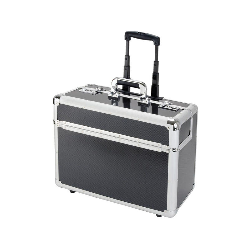 Valigia pilota Alumaxx C-2 in alluminio argento-carbonio. Sistema trolley integrato con ruote di qualità, maniglia resistente e bordi rinforzati. Versione interna: scomparto porta PC o tablet estraibile. Porta biglietti da visita e 3 portapenne nel coperchio pieghevole. Dimensioni 40x48,5x23 cm.