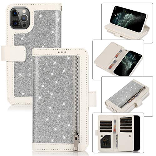 Custodia a portafoglio EYZUTAK per iPhone 13 Pro 6,1 pollici, tasca magnetica con cerniera in pelle PU con 9 slot per schede e cinturino da polso Custodia interna in TPU - argento