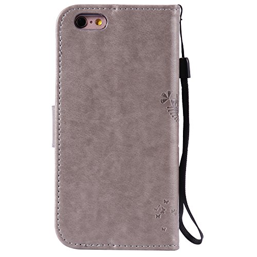 Custodia a portafoglio in pelle sintetica decorata in rilievo con motivo di albero, gatto e farfalla, con supporto per Apple iPhone, Ecopelle PLASTICA, gray, Apple iPhone 5 / 5S / SE
