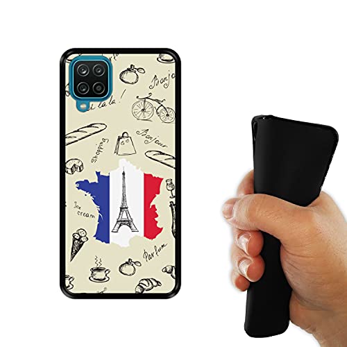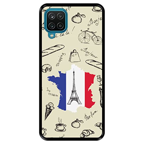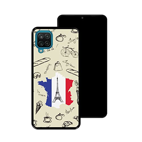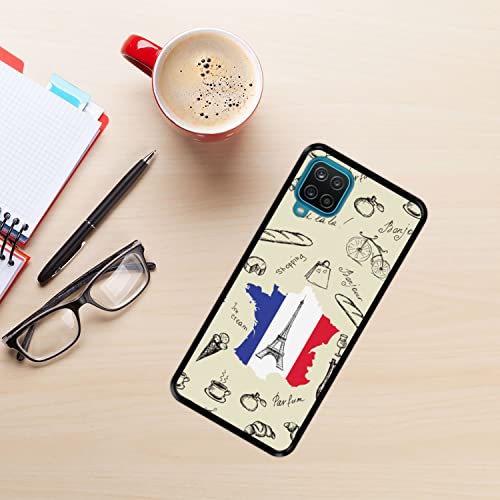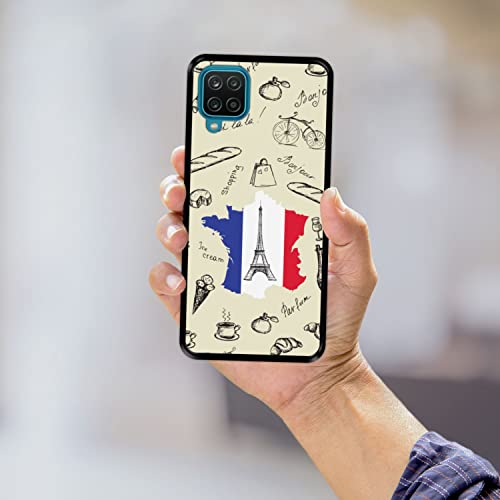 Custodia per [ Samsung Galaxy A12 ] Disegni [ Torre Eiffel, Mappa e la Bandiera della Francia ] Cover Guscio in Silicone Flessibile Nero TPU
