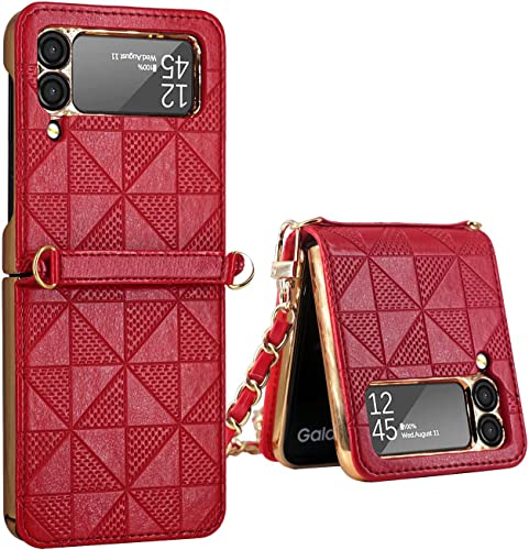 Custodia per Samsung Galaxy Z Flip 3 Custodia per telefono con schermo pieghevole ultrasottile, tracolla a catena placcata in oro Borsa per bellezza Shell, Cover telefono pieghevole per Flip 3 -Red