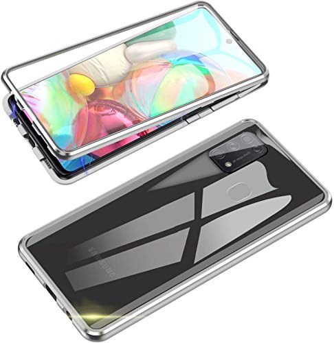 Custodia per Samsung Galaxy M31 Magnetic Cover,360 ° Metallo Bumper Trasparente Vetro Temperato Anteriore e Posteriore Protezione Completa Corpo Unico Design Flip Cover,Argento