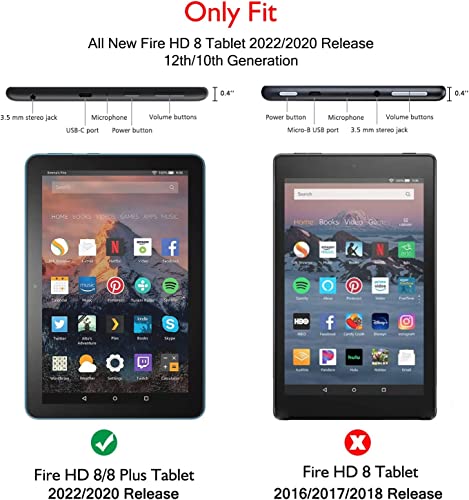 Custodia per Kindle Fire HD 8 con aperture precise: aperture per un accesso chiaro a tutti i pulsanti, le porte, gli altoparlanti e la fotocamera posteriore del tablet Fire HD 8 2022/2020. Nota: il tablet non è incluso, nessuna pellicola protettiva inclusa.