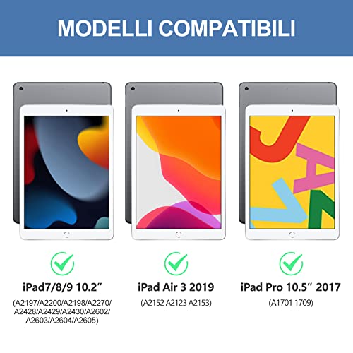 Compatibilità: La Custodia con tastiera per iPad 10.2 9a generazione 2021(A2602 A2603 A2604 A2605)/iPad 8a generazione 2020(A2270 A2428 A2429 A2430)/ iPad 7a generazione 2019(A2197 A2200 A2198)/ iPad Pro 10,5 pollici 2017 (A1701 A1709 A1852)/ iPad Air 3 2019(A2152 A2123 A2153 A2154).