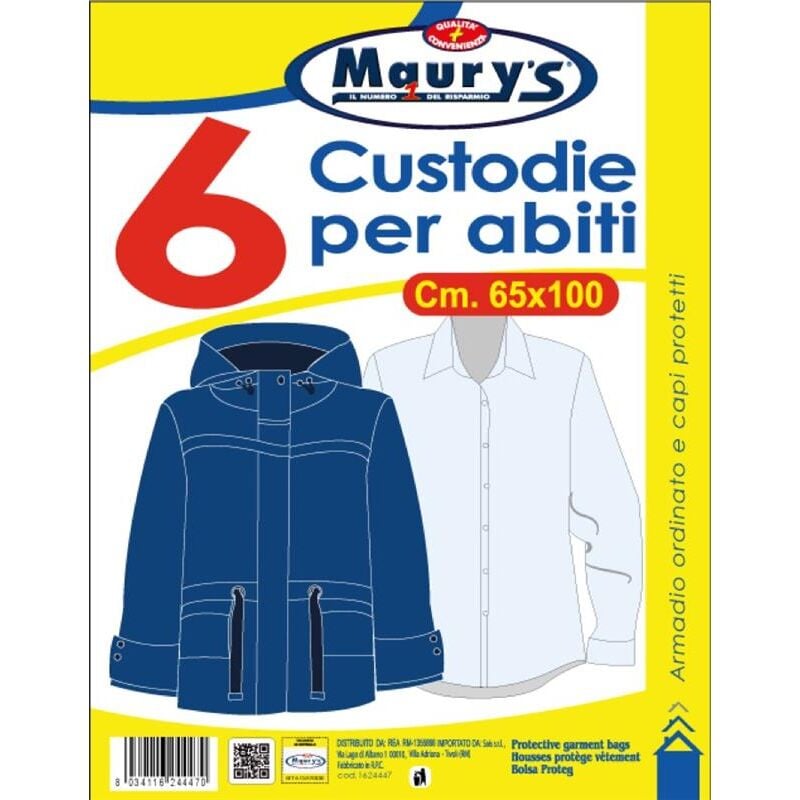 Per il tuo guardaroba le custodie Maury's sono l'ideale per tenere lontano polvere. umidità e sporco dai tuoi vestiti. Copriabiti per armadio Colore: trasparente Materiale: plastica Misure: 100 x 65 cm Confezione da 6pz Cambio stagione