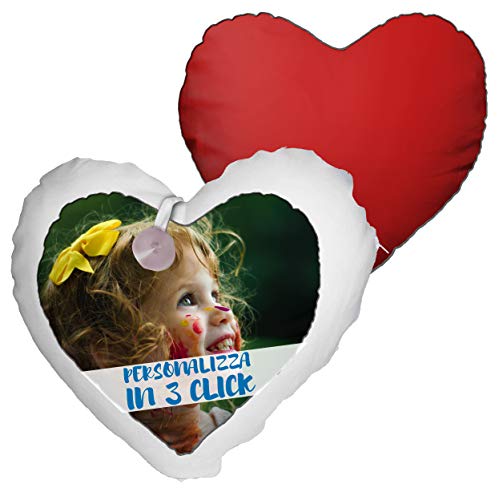 Cuscino a forma di cuore pre-confezionato da 20cm + ventosa. Il lato stampato è in poliestere e il retro in cotone di colore rosso. Il lato in poliestere è personalizzabile con stampa di qualità fotografica, fino a pochi cm dal bordo che resterà bianco per la presenza delle cuciture e della cerniera. Sfoderabile e lavabile in lavatrice. IMBOTTITURA INCLUSA.