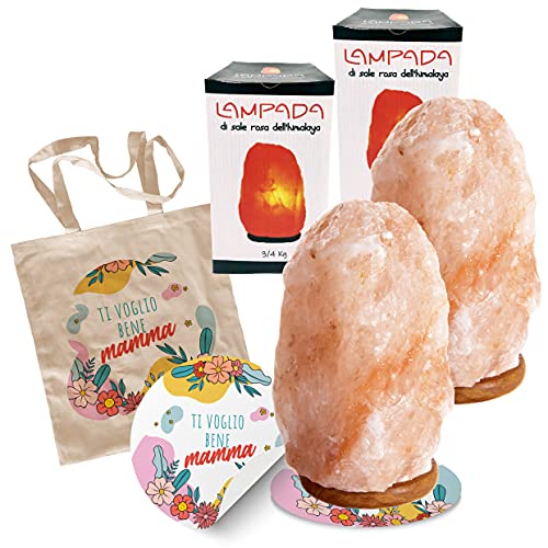 2 lampade di sale rosa dell'Himalaya (Punjab-Pakistan) in special edition a tema #Mamma -Ti voglio bene Mamma-#, da 3-4kg (altezza20-22cm) con base in legno di cedro. Il set include 2 tappetini sotto lampada da 19cm in microfibra ultra sottile da 1mm e base dotata di micro ventose, e una shopper in cotone da 140gr/mq, il tutto a tema della grafica selezionata. Lampada originale, composta al 100% da cristalli di sale rosa naturale, antichi di milioni di anni.