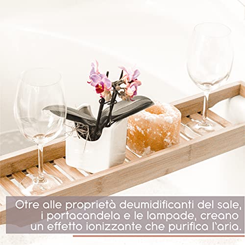 IONIZZATORE NATURALE -La lampada riporta l'equilibrio tra ioni positivi emessi dai dispositivi elettronici e quelli negativi in maniera del tutto naturale. DEPURA L'ARIA -Il calore emesso dalla lampadina al suo interno riscalda il sale rendendo la lampada un deumificatore naturale. CROMOTERAPIA -La gradevole luce emessa dalla lampada, nei colori naturali dal bianco all'arancione, influenza il nostro benessere spirituale ed emozionale in modo benefico.