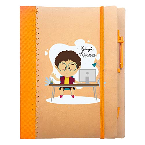 Quaderno notebook da 70pagine bianche + penna #scuola-1# colore avana-arancione, dimensione 21x14,8cm. Copertina in cartoncino riciclato da 480grammi con elastico. e penna a tono. Stampato con tecnica digitale UV, ad alta risoluzione, per un risultato bello, nitido e duraturo. Prodotto ecologico.