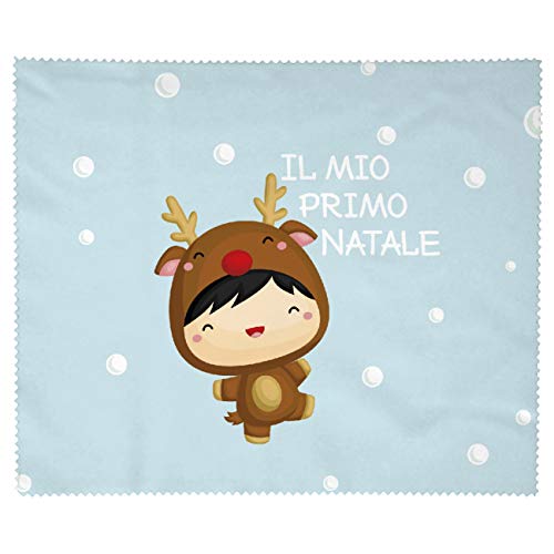 Panno in microfibra modello #Natale - Primo Natale 5#, dimensione cm 15x18. Salvietta, pezzolina pulisci occhiali - smartphone - pc - lenti e obiettivi per fotocamera o videocamera. Realizzato con stampa sublimatica indelebile su morbida microfibra, ideale per pulire senza lasciare segni o graffiare superfici delicate. Scatola da regalo a cuscino, INCLUSA NEL PREZZO, o personalizzabile con supplemento. Originale idea regalo o bomboniera.