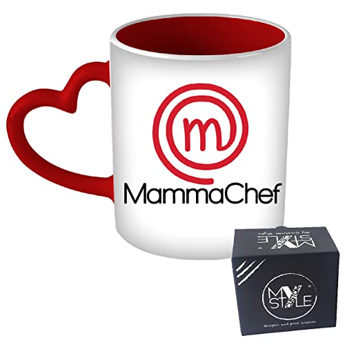 Tazza da 325ml, con manico a CUORE ROSSO in ceramica #Mamma - Mamma Chef# . Stampata con tecnica sublimatica, per un risultato di eccezionale bellezza.